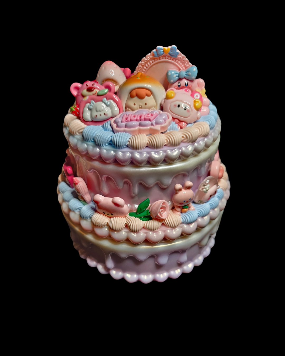 Double-layer cake trinket box. Resin with colored "frosting" and cartoon characters.